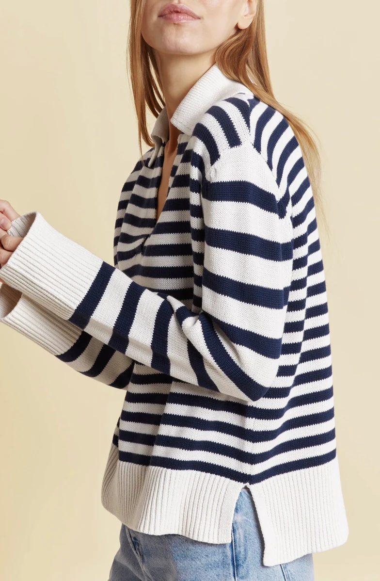A relaxed fitting V neck jumper in a mixed navy and cream stripe. Featuring a cream collar and cuffs and stepped hem with side splits.
