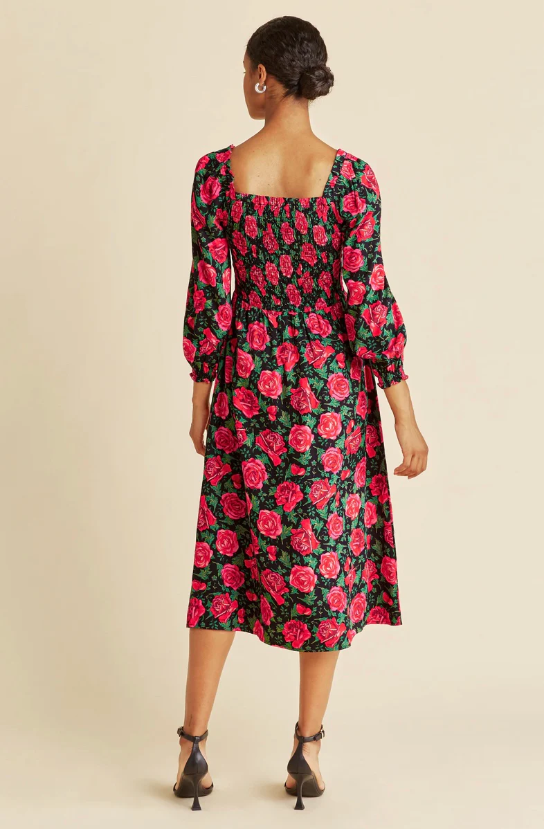 A square neck midi dress designed with a shirred bodice and full skirt. Featuring soft elastic shoulders and cuffs with a ruffle trim. In a standout red and green rose print on a black base.