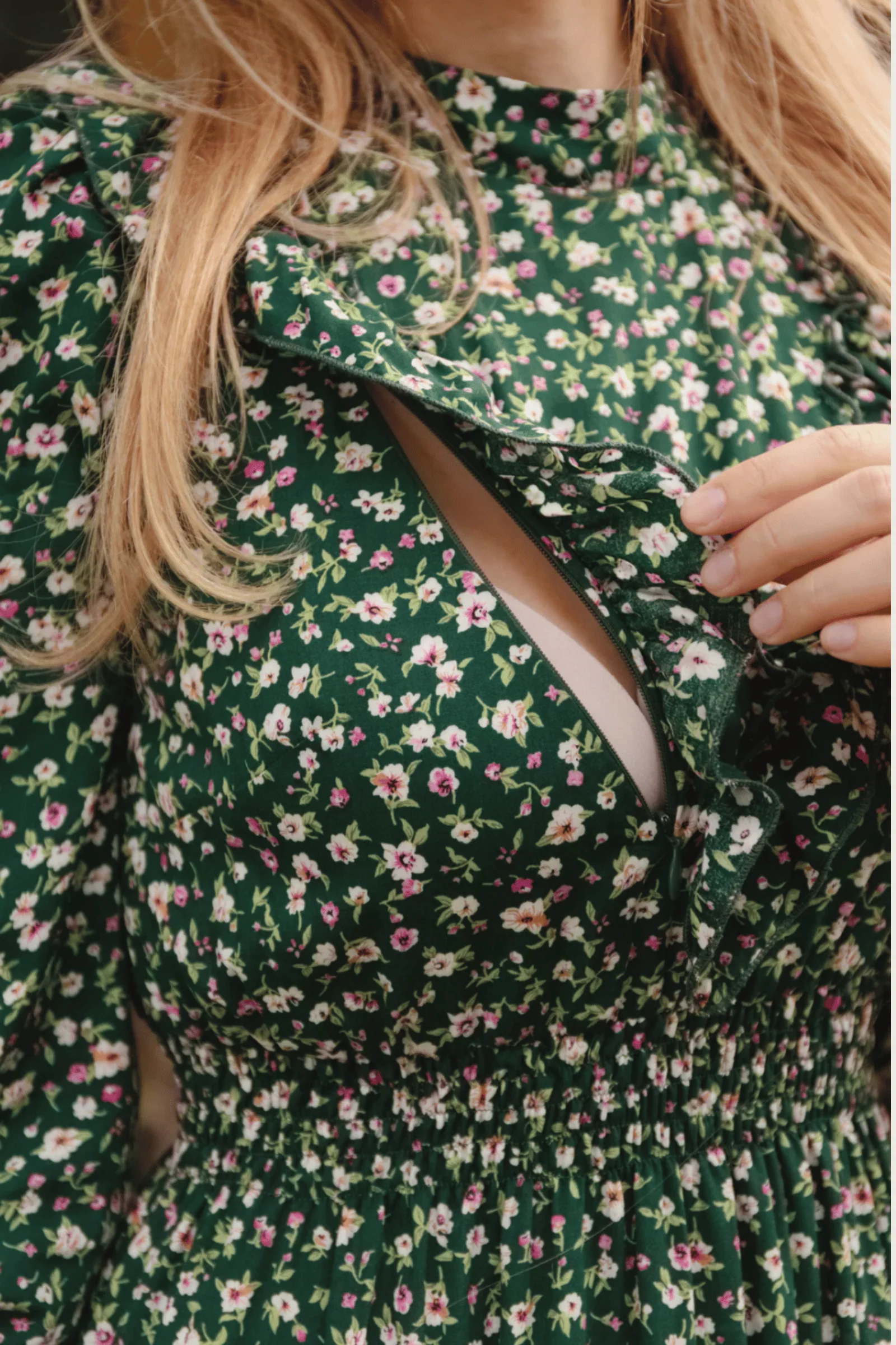 In a green floral print with a high neckline and a frilly yoke, the Bump & Milk Jacali nursing dress is designed for sweet sophistication. The dress has a gently elasticated waistband to stretch across your bump and features hidden zippers under the bust so that you can keep breastfeeding wherever you go. With finished flattering 3/4 length sleeves with an elasticated cuff and brought a midi length skirt for total freedom and flexibility.