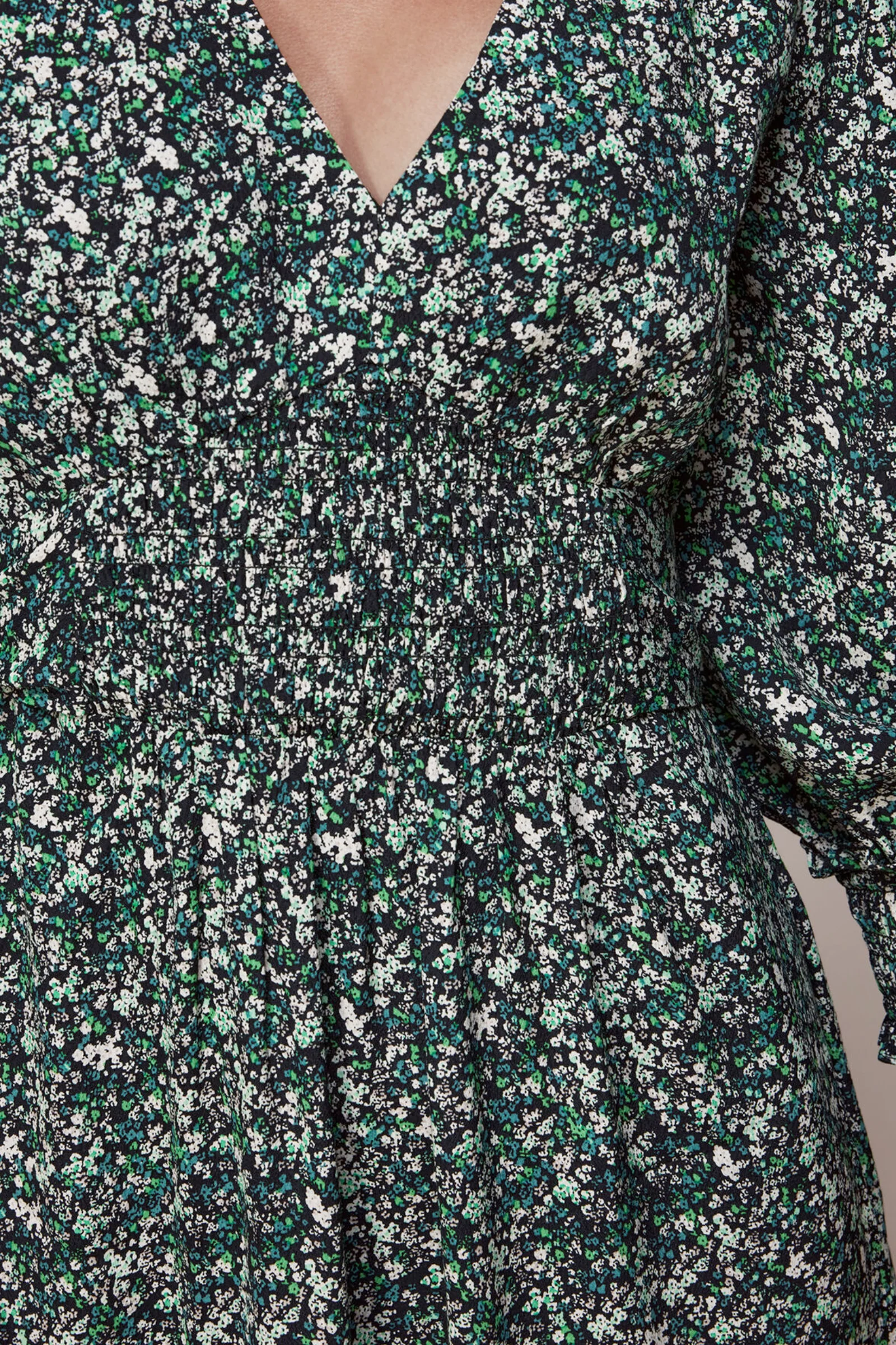 The Edie is printed with romantic florals set against a soft green backdrop. Cut from a fluid textile, it's detailed with a shirred waist and tie back.