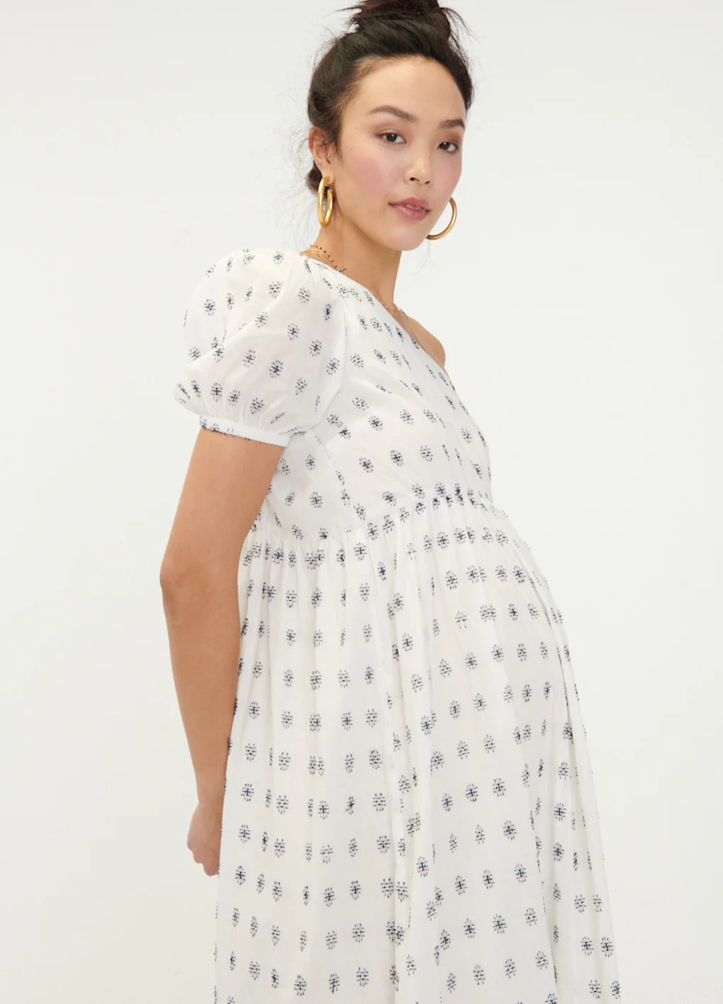 THE ELLE DRESS. Made for Maternity. Every maternity wardrobe needs a one-shoulder dress, no? In 100% cotton with beautifully embroidered crosshatch designs, an ever so slightly slightly puffed sleeve, grow-with-you elastic at the back waistband, and a versatile midi length (plus its fully-lined, too).