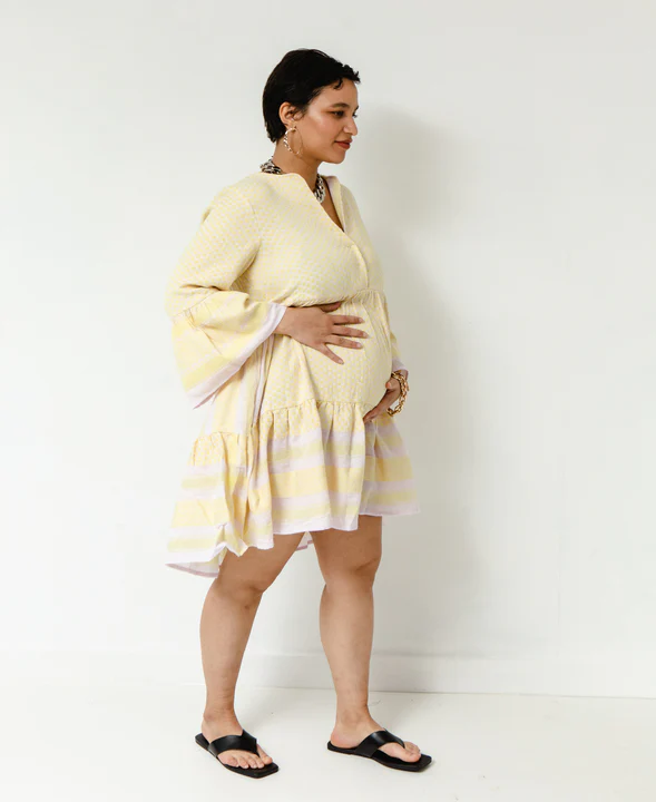 Julia is an empire-style mini-dress with trumpet sleeves, a button-up top and modest ruffles on the bottom. Show the world your bold taste with this gorgeous florentine blue colour combination in a dogtooth pattern.