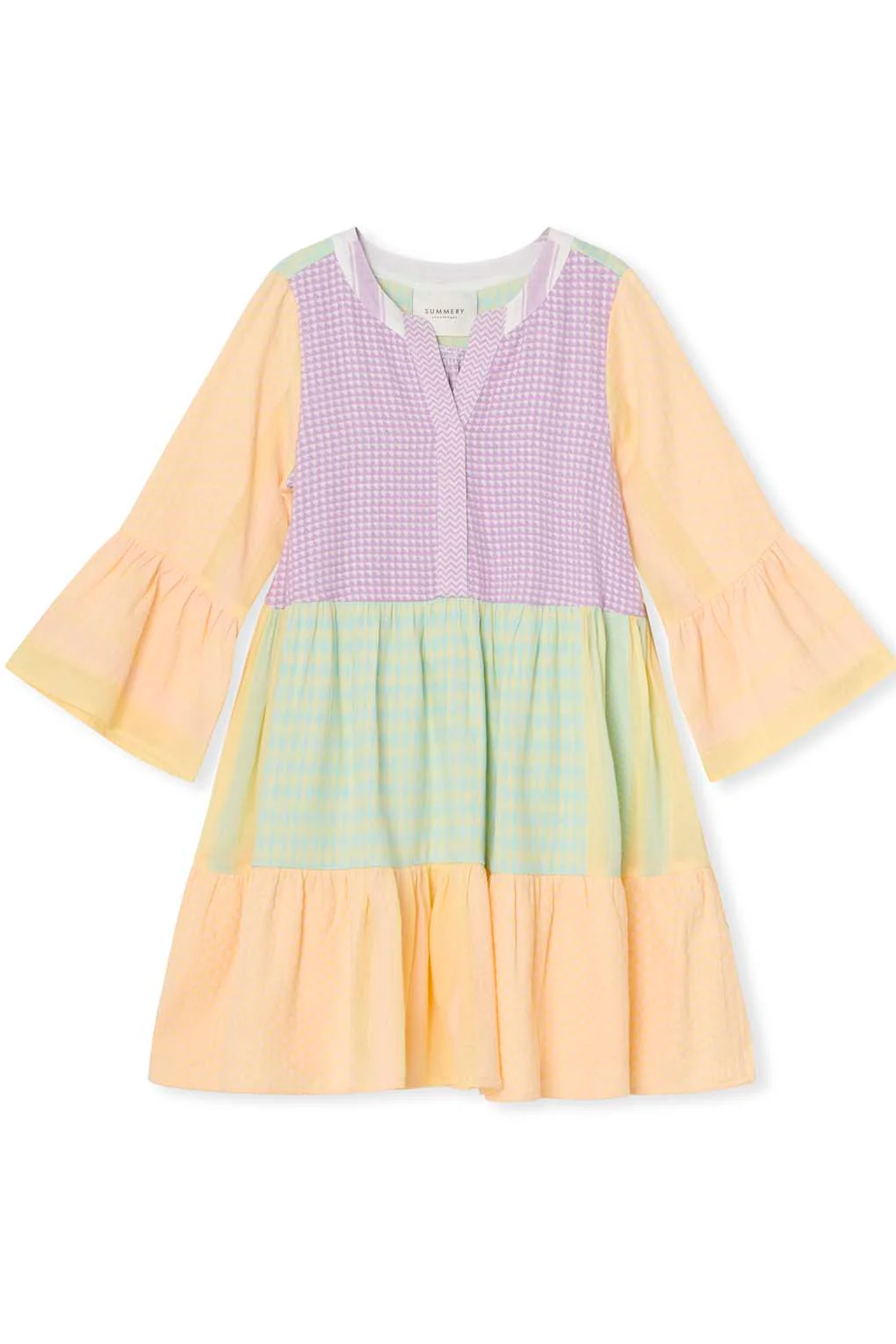 Kenya Dress - a summery dream in colourful patterns. The mini-dress features an empire style with trumpet sleeves, a button-up top and modest ruffles on the bottom.