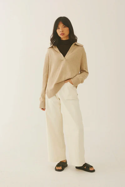 The Luca Pullover is a 55% Responsible Wool Standard Extrafine Merino wool 45% Cotton blend collared sweater with side split detail and large cuff.