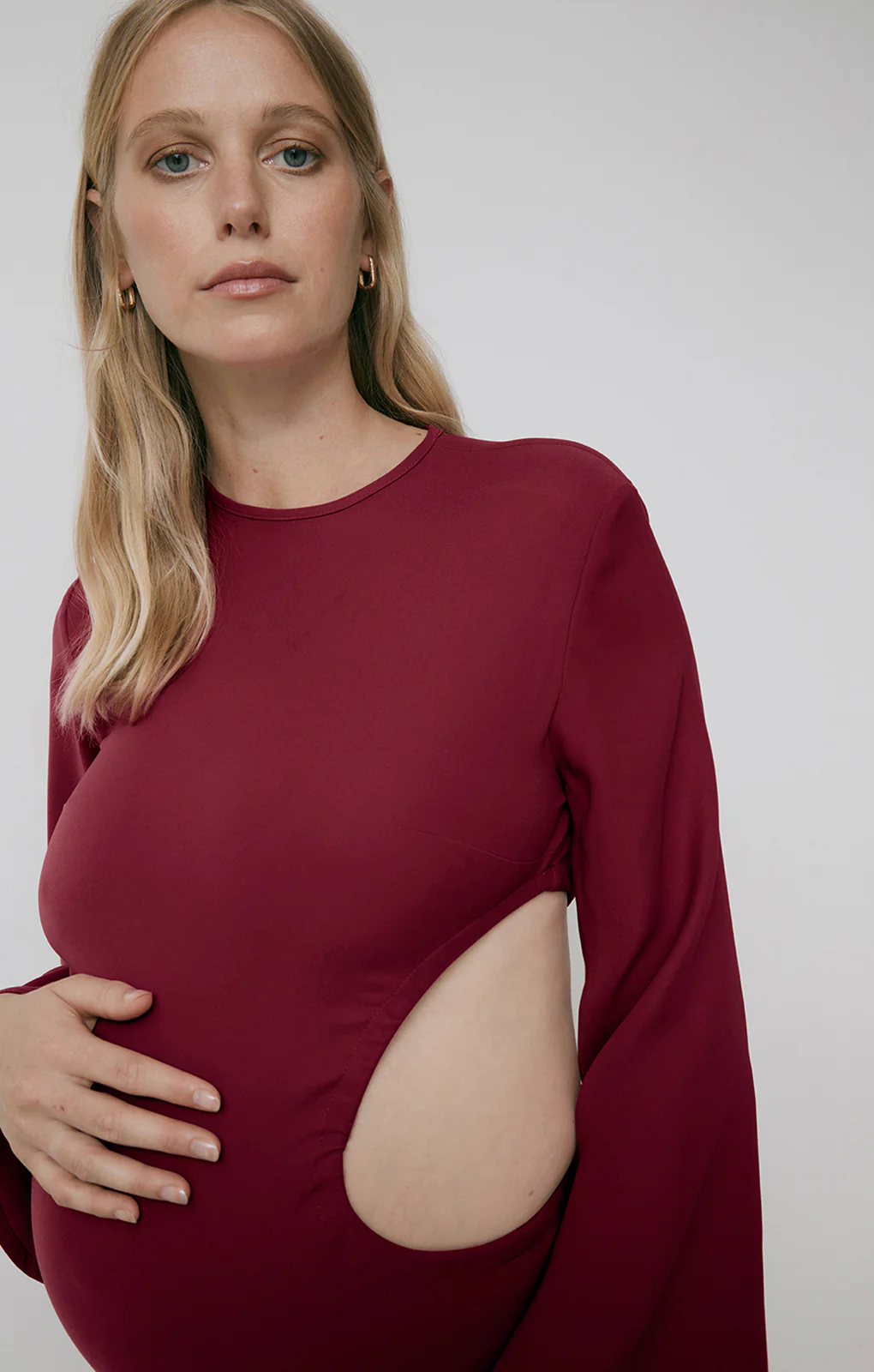Be bold in the Nixi, our dark berry midi length dress. Its adjustable waist detail can be altered to fit your changing shape as it evolves through pregnancy and cinched in postpartum. The A-line shape, cut out detail and exaggerated flute sleeve makes this a staple occasion dress.
