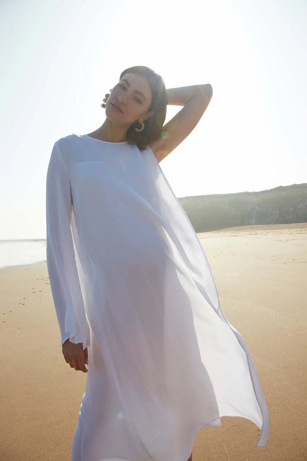 White asymmetric a-line dress with fluted sleeve. Cleverly designed for easy breastfeeding.
