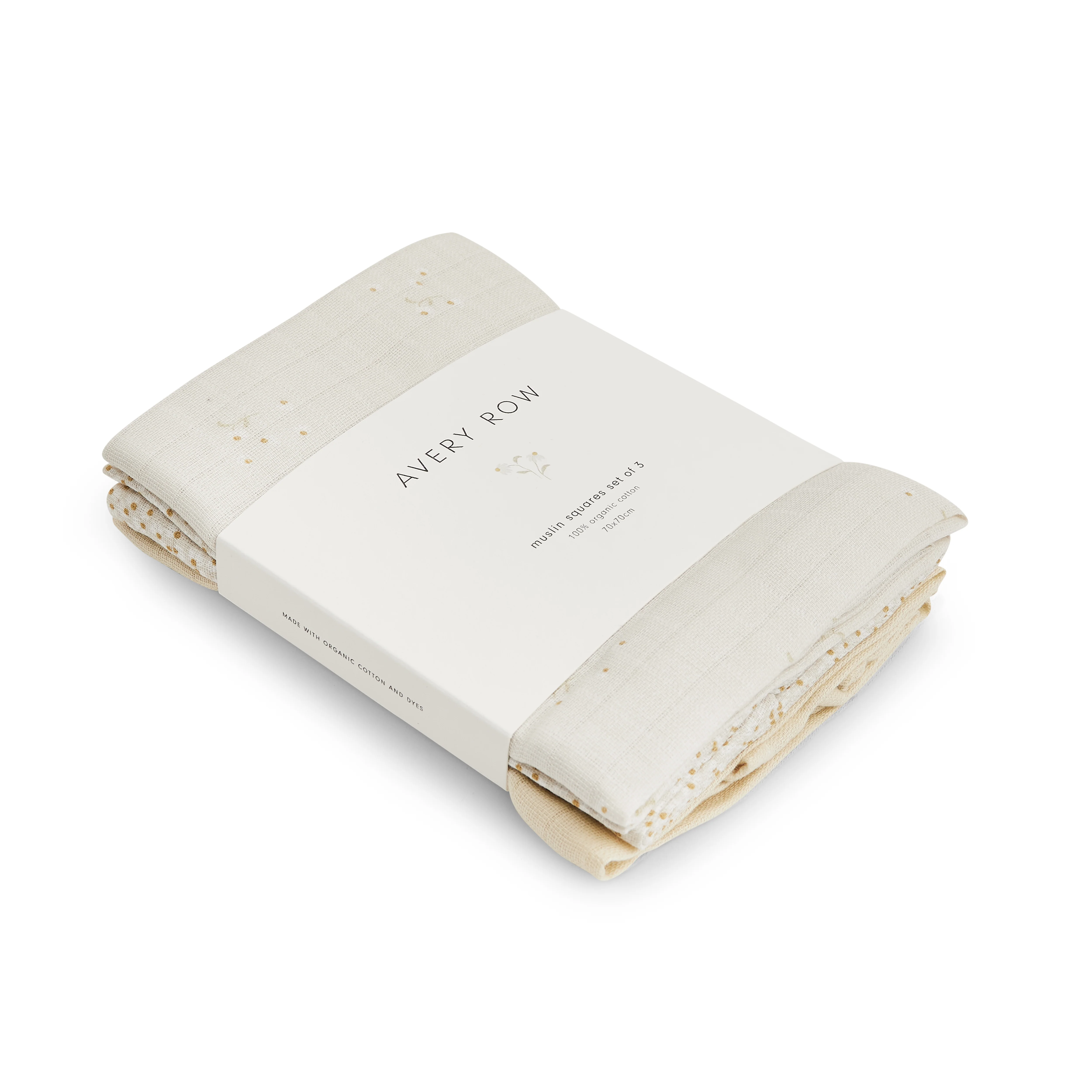 Set includes 3 muslin squares.