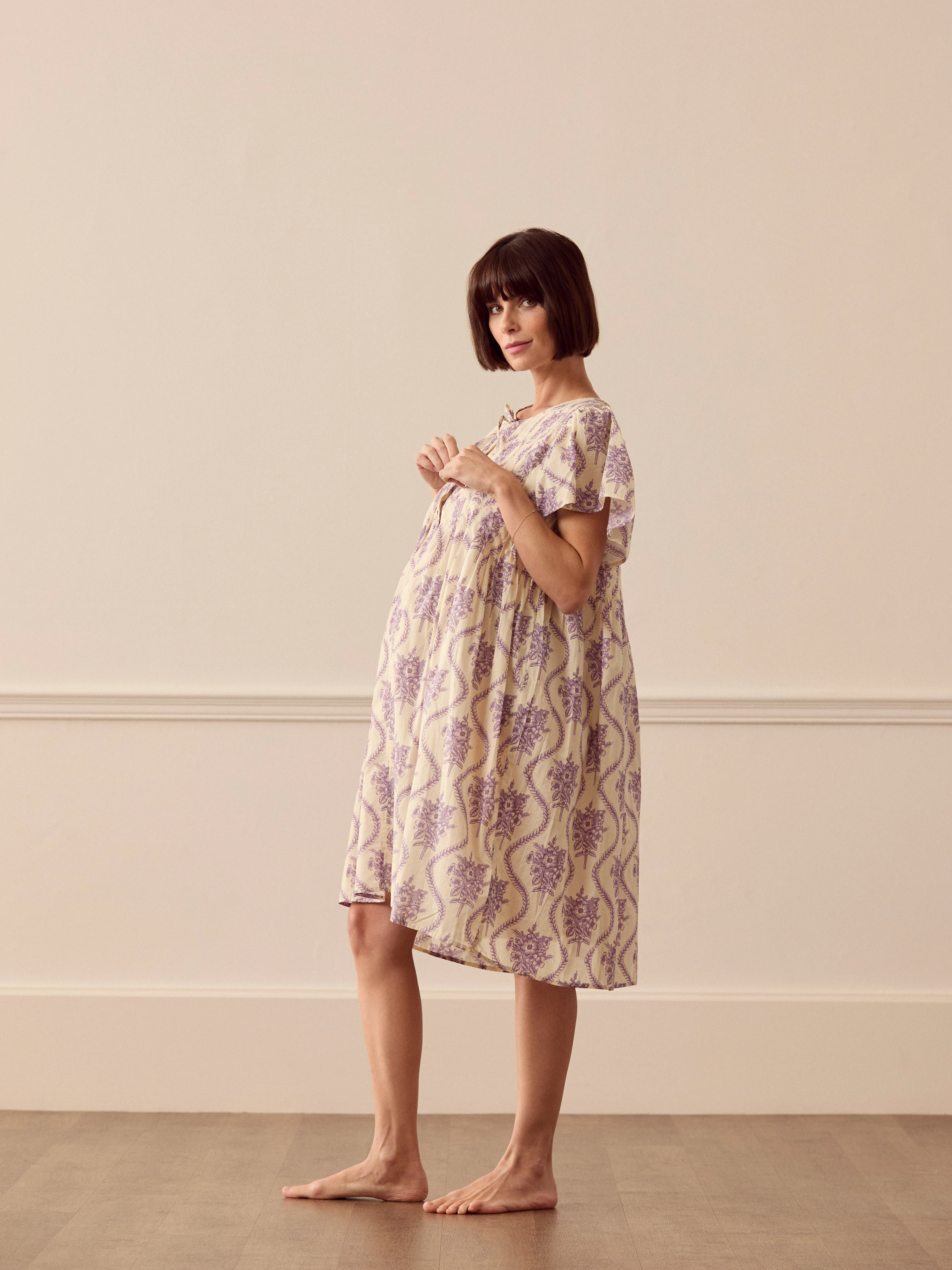 Inspired by a D&D favourite, the pleated cami. But make it a nightie. Features engineered pleats, a 2x tie front closure with keyhole opening, half lining, & cap sleeves. Finishes on the knee and pleating creates a full skirt, A-line silhouette.