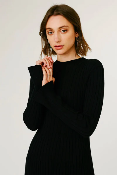 Ribbed midi knit dress with a high neck and side slit detail on sleeves.
